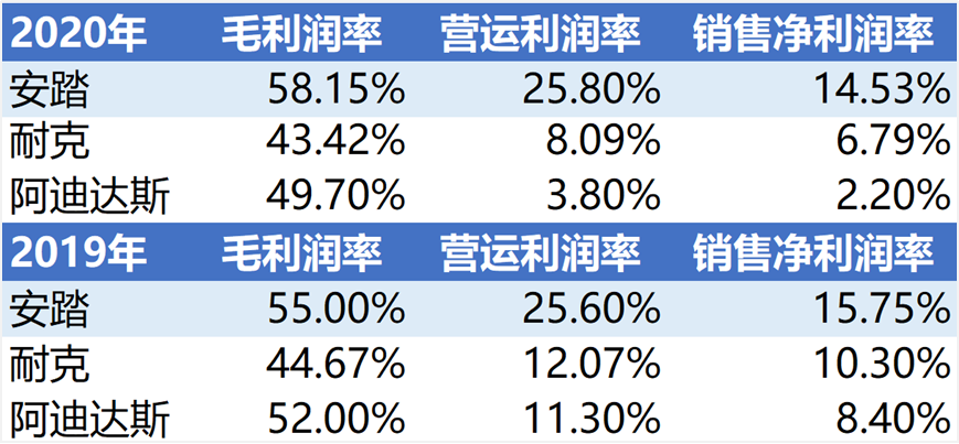 總結下來,安踏體育在營收規模上還遠趕不上耐克、阿迪,但是利潤率卻顯著高于這兩家,所以在2020年疫情的影響下,安踏的利潤超過了阿迪達斯。