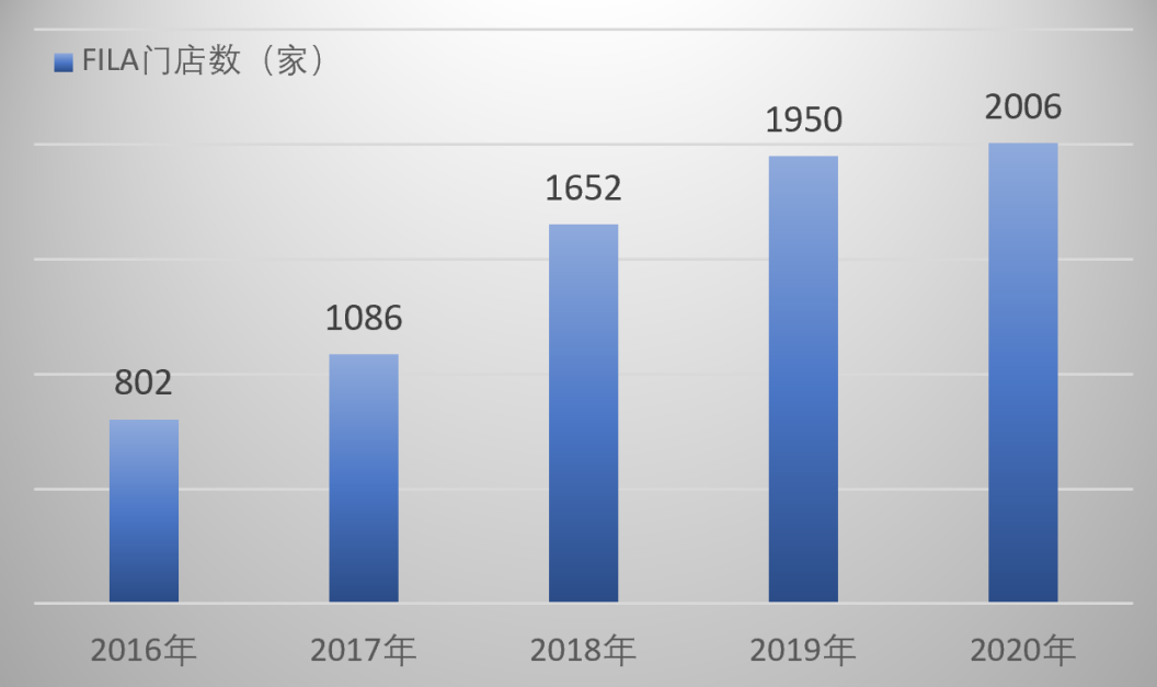安踏還趁著FILA品牌的全球復蘇快速擴店,2016年安踏擁有的FILA門店(包括中國內地、香港、澳門和新加坡)僅802家,2020年已經達到2006家,擴張趨勢迅猛。