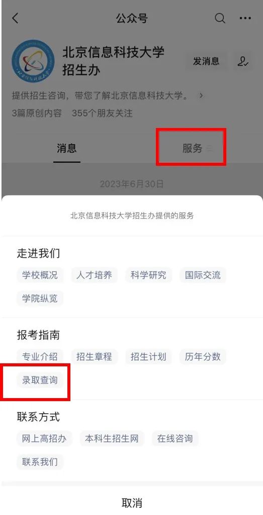 關注北京信息科技大學招生辦微信公眾號,并持續關注每日微信推送,在收到本省錄取結束微信推送文章后,進入招生辦微信公眾號主頁,點擊導航欄報考指南-錄取查詢,查詢錄取結果及錄取通知書EMS快遞單號。