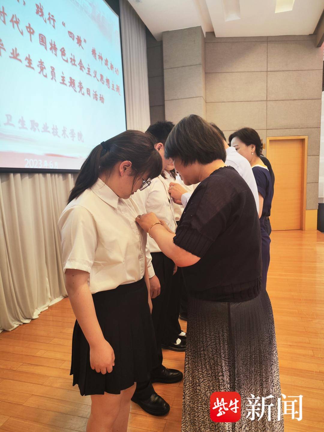 學校各二級黨組織負責人為畢業生黨員們戴上嶄新的黨員徽章。學校黨委學生工作部副部長杭金菊帶領全體畢業生黨員重溫入黨誓詞,引領大家尋回入黨初心。