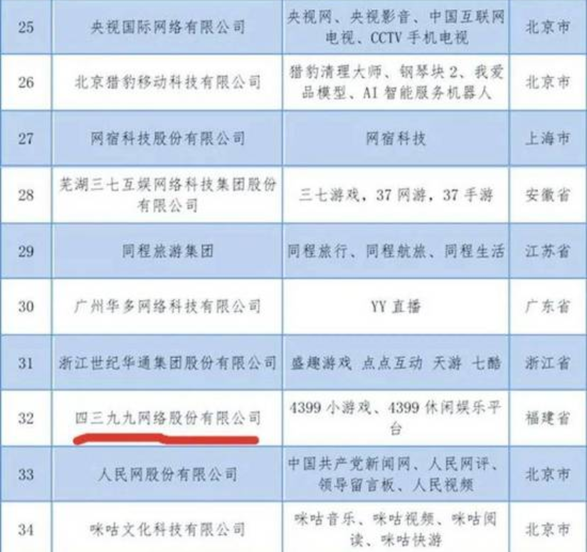 10月30日,中國互聯網協會發布互聯網百強企業名單,4399排名第32。