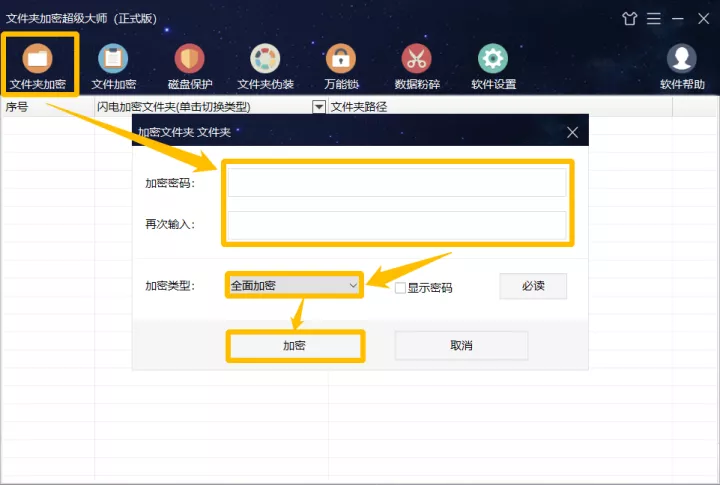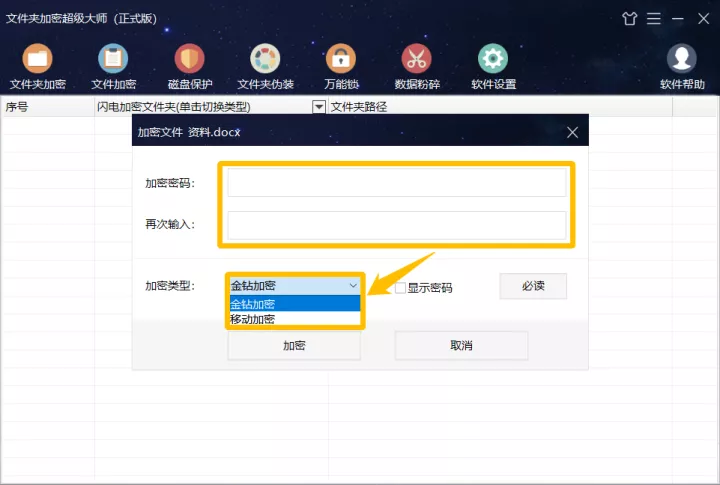 金鉆加密、移動加密和全面加密強度高,所以無法找回密碼,需要牢記加密密碼,可在加密時勾選“顯示密碼”進行確認。