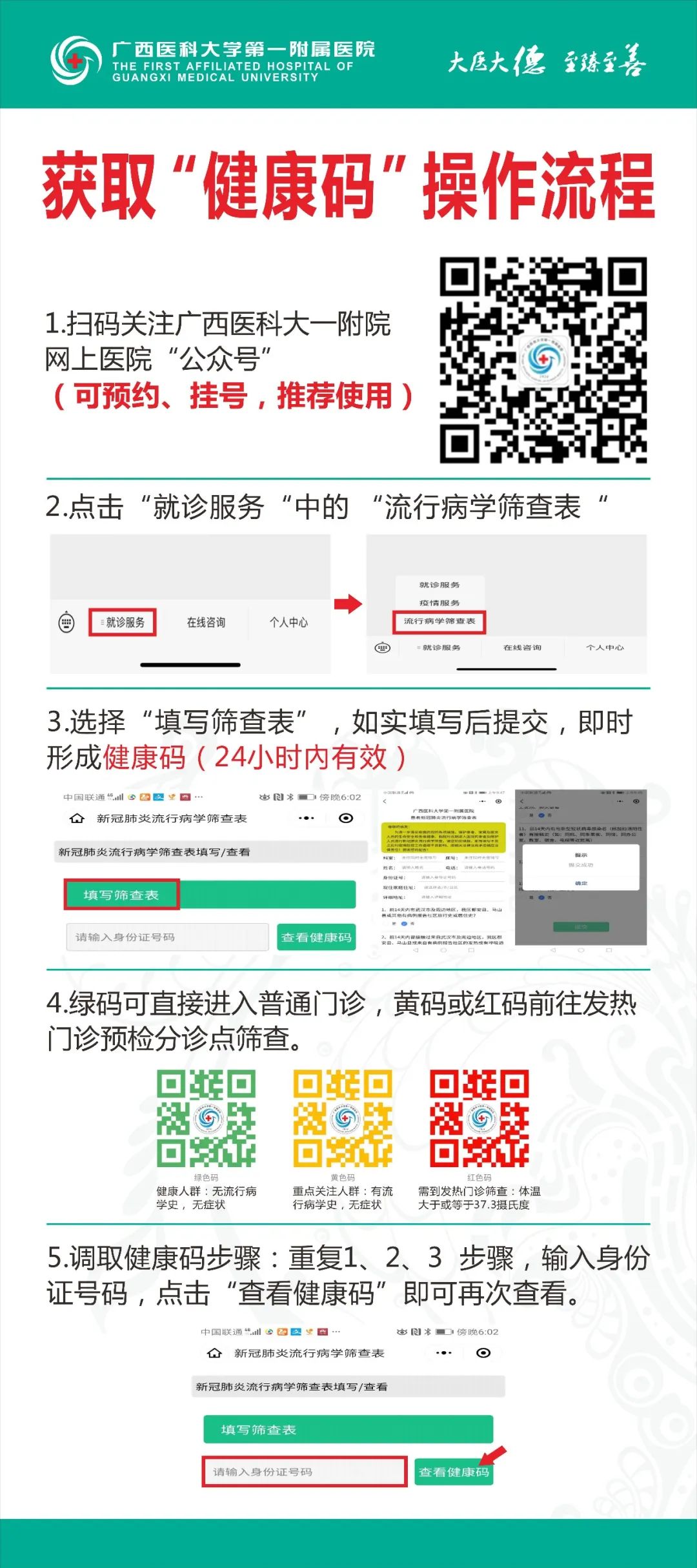 到院就診前,為節省您的時間,減少人員聚集,請您和陪人先在線上填寫“流行病學篩查表”,提交后獲取“健康碼”(24小時有效)。具體操作流程如下: