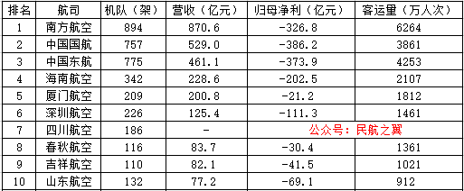 今天翼哥對國內十大客運航空公司進行排名,以營業收入為第一指標,機隊規模第二指標,旅客運輸量第三指標。