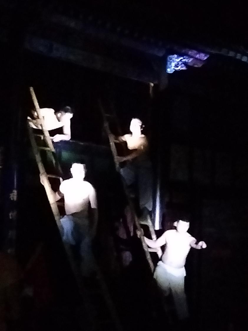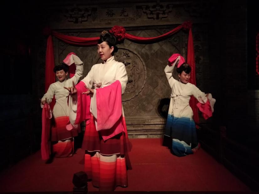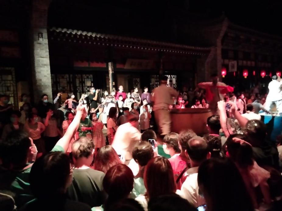 晚上往北折返平遙古城,看《又見平遙》。《又見平遙》的創作方式是搭建了一個僅為一出劇目服務的巨型劇場,在其中仿建了古平遙城內的重要街道和商家大院,演員著古代服飾參與演出,通過劇情引導觀眾穿梭在各個場景之間,進而使觀眾可以領略古代平遙城內普通人的生活習俗和鄉土儀式。這是一個關于“死鏢”的故事。清朝末期,平遙古城票號東家趙易碩抵盡家產,從沙俄保回了分號王掌柜的一條血脈。同興公鏢局232名鏢師同去。七年過后,趙東家本人連同232名鏢師全部死在途中,而王家血脈得以延續。