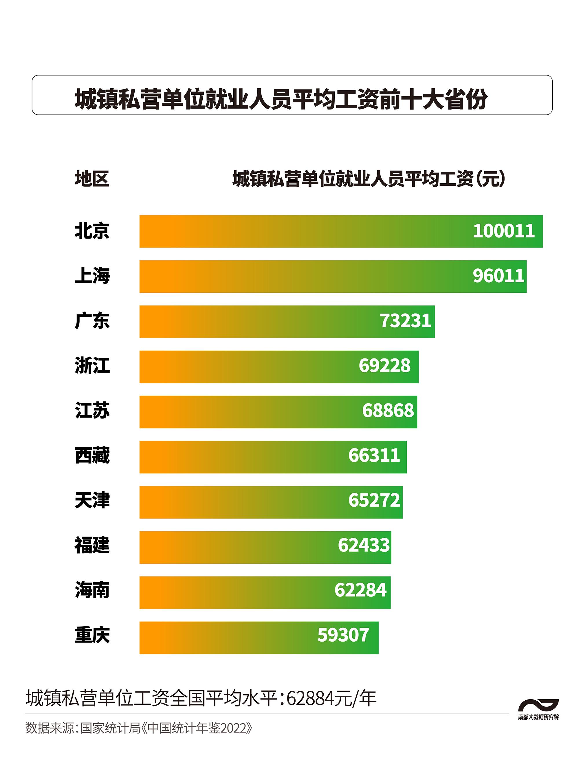 近日,國家統計局編著出版的《中國統計年鑒2022》公布了2021年31個省份的城鎮非私營單位和私營單位的就業人員平均工資數據。 從平均工資來看,非私營單位中,北京、上海、西藏、天津、浙江、廣東、江蘇、青海、寧夏和重慶共10個省份超過10萬元。年平均工資最高的3個行業為IT業、科學研究和技術服務業和金融業,分別為全國平均水平的1.89倍、1.42倍和1.41倍。