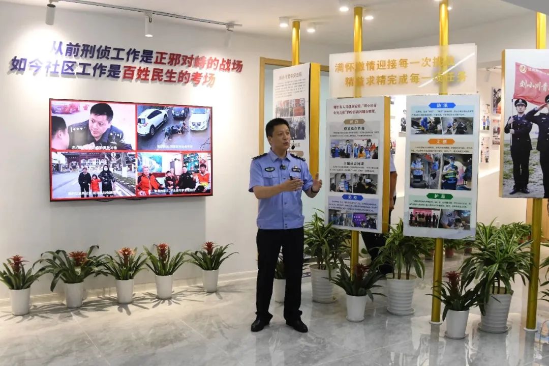 在劉小川英模警務室,劉小川分享了自己的入學經歷,回憶了自己的入警初心和從警經歷,并講述自己從一名刑偵民警轉崗為社區民警的從警故事。劉小川勉勵新生,要堅定理想信念、恪守從警初心,始終將“對黨忠誠、服務人民、執法公正、紀律嚴明”總要求銘記在心、付之于行,做新時代公安事業可靠接班人。