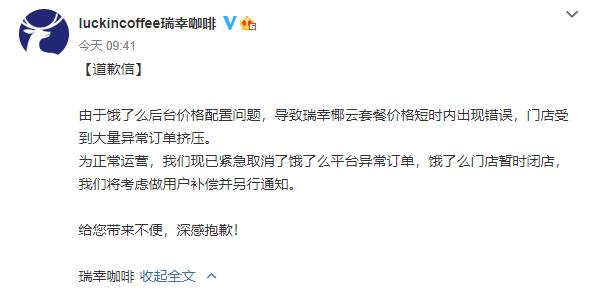 對此,瑞幸咖啡官方發布道歉信,稱由于餓了么后臺價格配置問題,導致瑞幸椰云套餐價格短時間內出現錯誤,門店受到大量異常訂單積壓。為確保正常運營,公司已經緊急取消了餓了么平臺異常訂單,餓了么門店暫時閉店。至于被取消訂單的小伙伴,目前官方還在考慮做用戶補償并另行通知。