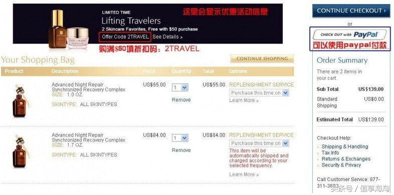 6、結賬頁面上方會顯示網站的優惠活動,大家也不要過錯哦,多數都是購物滿多少金額就可以拿到贈品的活動,上面有優惠碼,如圖所示填入優惠碼贈品就會出現在購物車里了;
