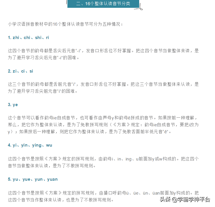 我們所學的整體認讀音節包括16個,分別是zhi,chi,shi,ri,zi,ci,si,yi,wu,yu,ye,yue,yuan,yin,yun,ying。何為整體認讀音節,即不用拼讀直接讀出的音節。