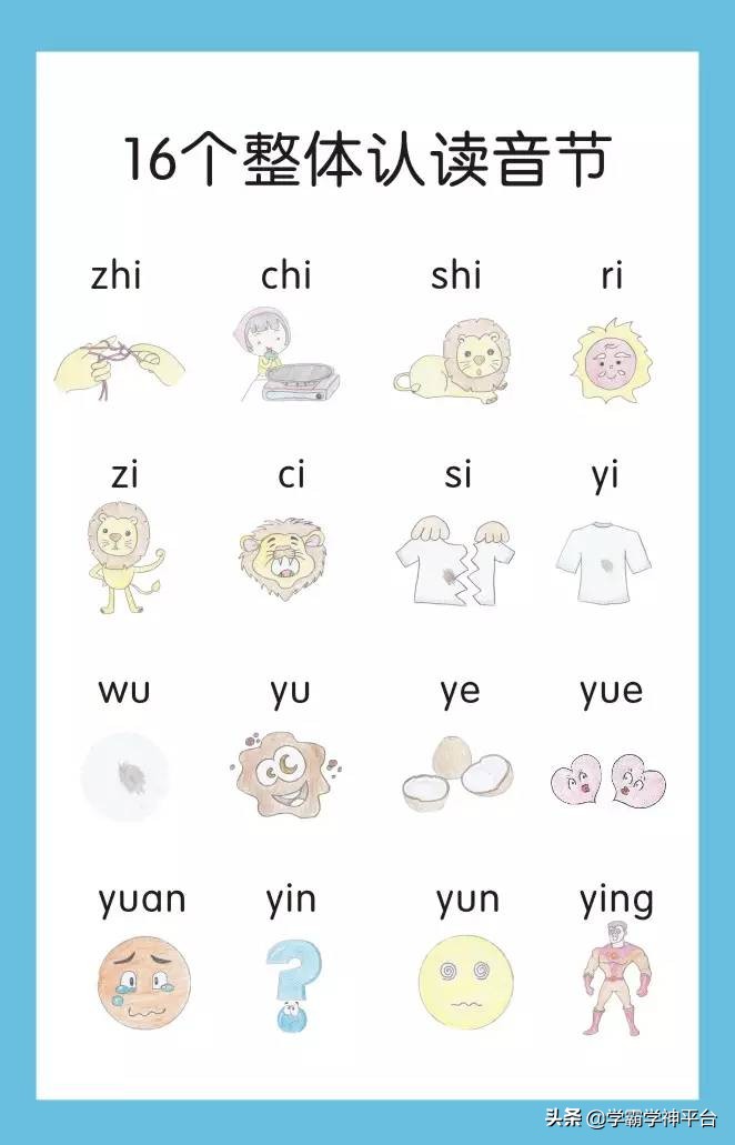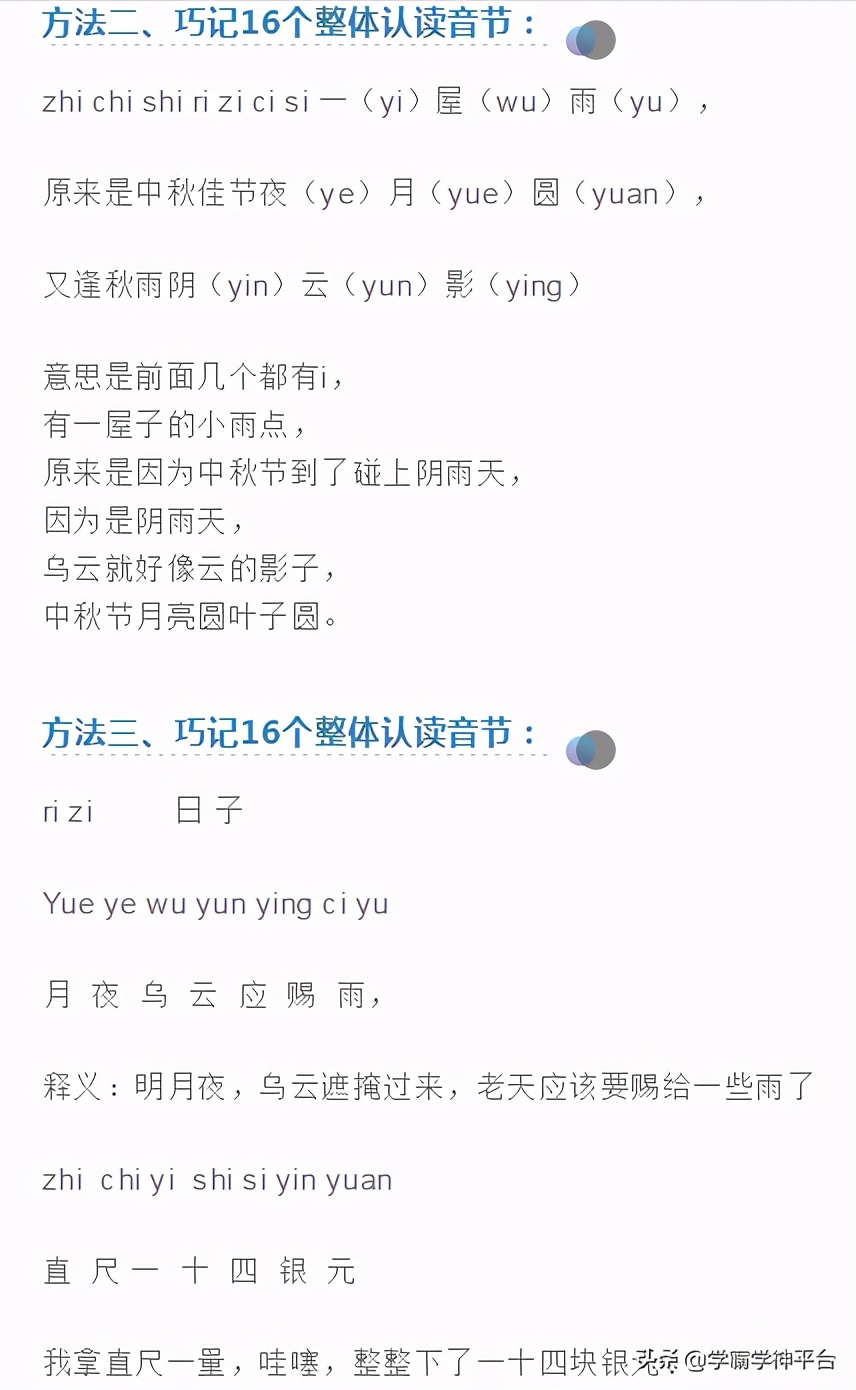 導讀巧記整體認讀音節,老師家長一致認為,這方法好。我們所學的整體認讀音節包括16個,分別是zhi,chi,shi,ri,zi,ci,si,yi,wu,yu,ye,yue,yuan,yin,yun,ying