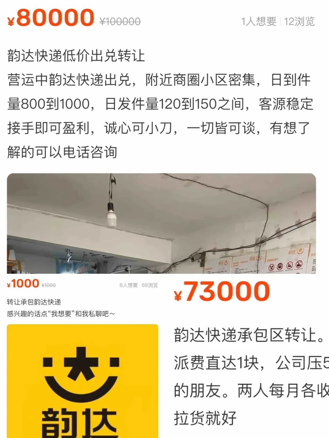確實,市界在閑魚上發現,有大量韻達快遞網點在轉讓,涉及云南、湖北、黑龍江、廣東、河南、四川等多個地方,有一級網點也有二級網點,并且打上了低價出兌轉讓的標簽,看上去很急的樣子,有的報價甚至低至幾千、幾萬元。