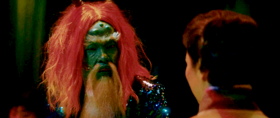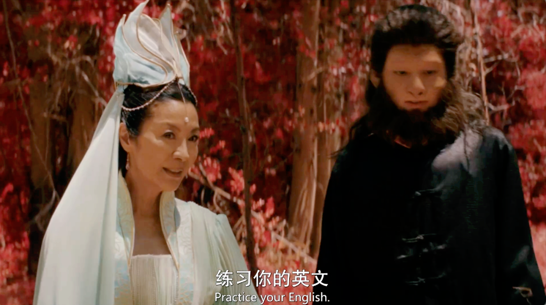 而當楊紫瓊蹬著厚底高跟涼鞋,一身媽祖的裝扮出場,張口就跟孫悟空兒子說:讓我們練習一下英語吧!