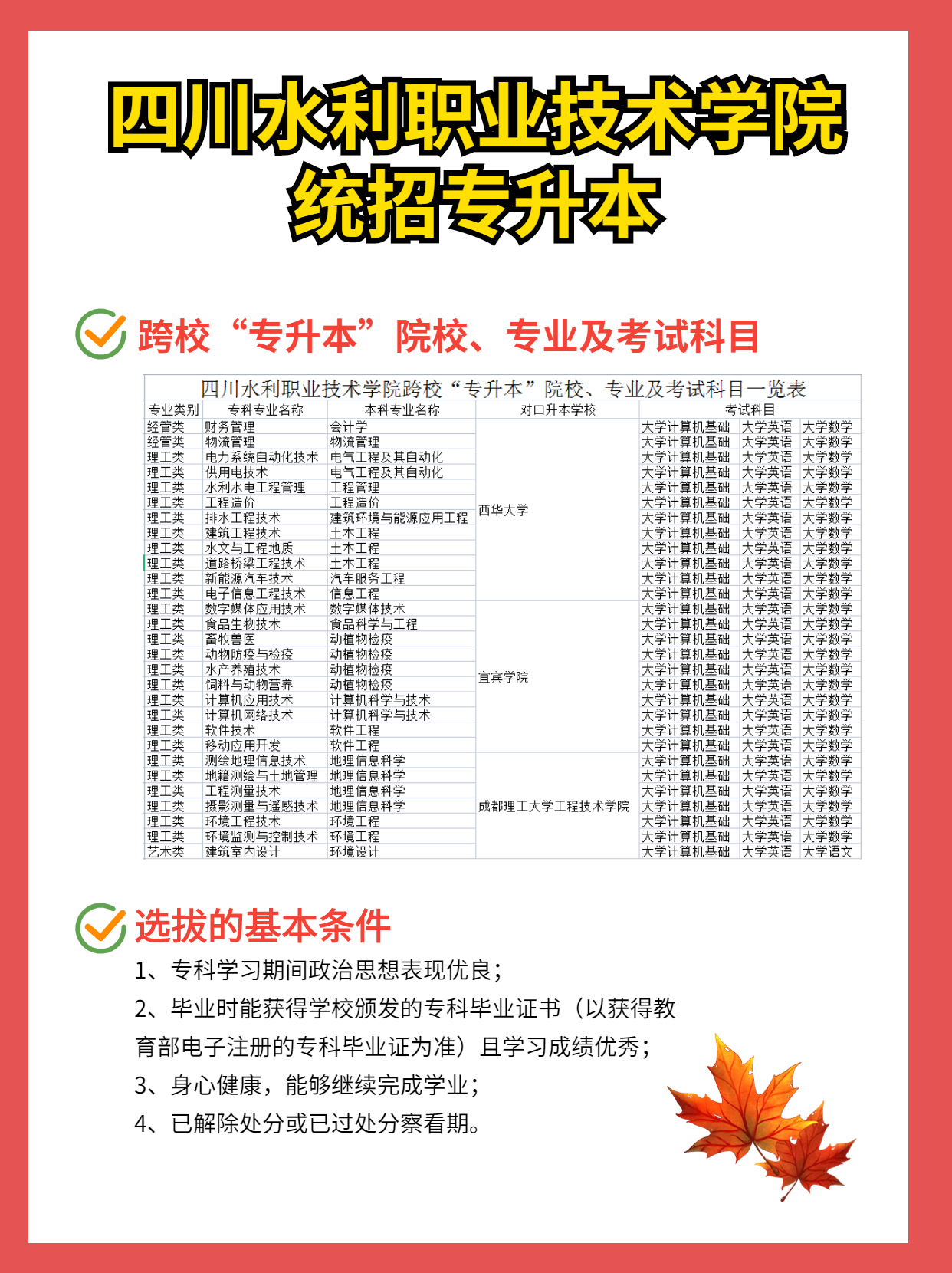 導讀四川水利職業技術學院的統招專升本一,跨校專升本院校、專業及考試科目。二選拔基本條件1、專科學習期間政治思想表現優良;2、畢業時能獲得學校頒發的專科畢業證書且