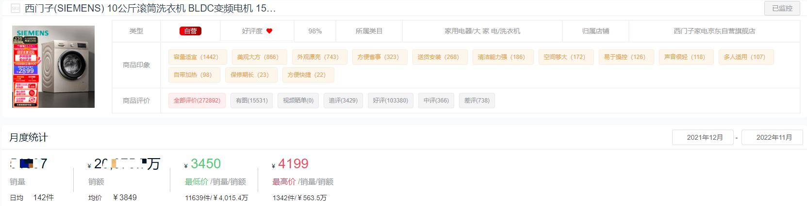 西門子的這款10公斤變頻滾筒洗衣機比較受歡迎,今年京東平臺上累計銷量超5萬件,累計銷售額超2億元。該款產品歷史最低價曾低至3450元,最高價格達4199元。