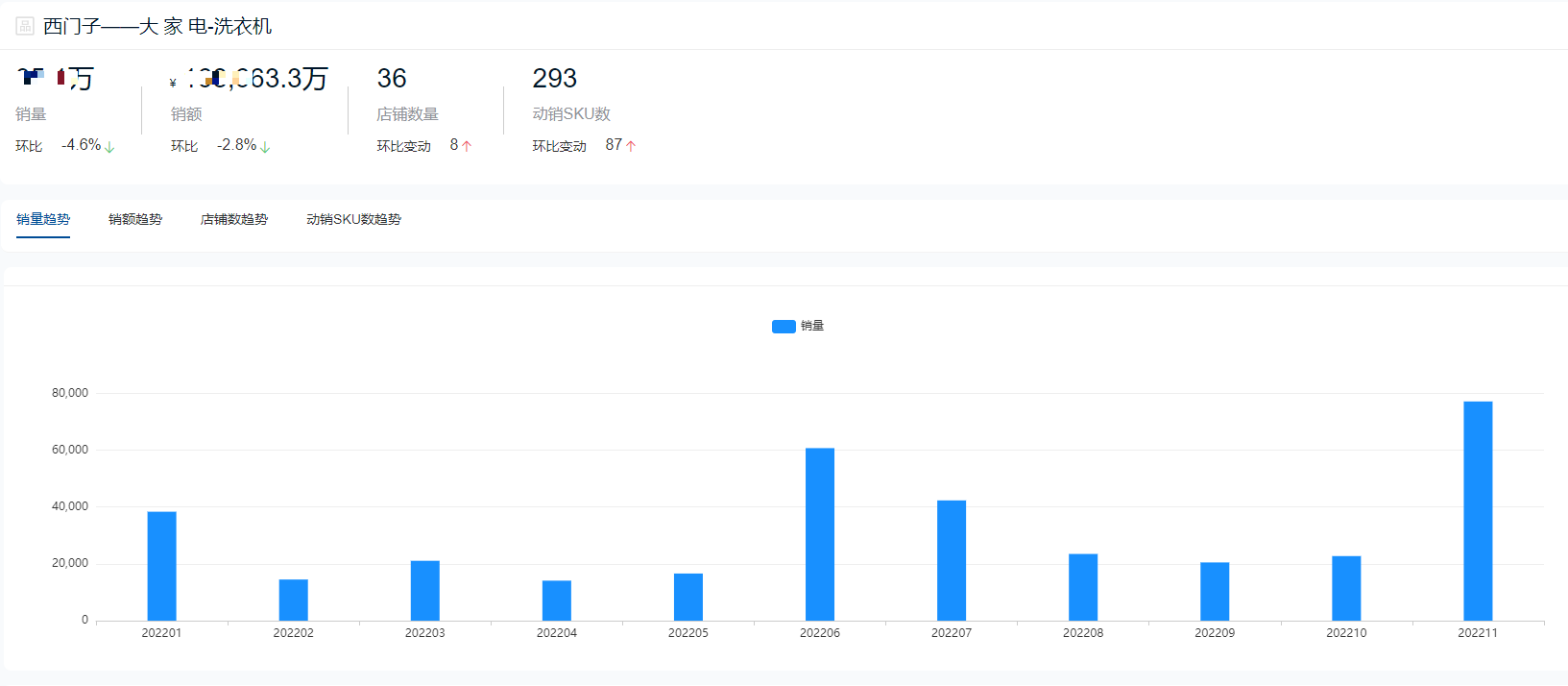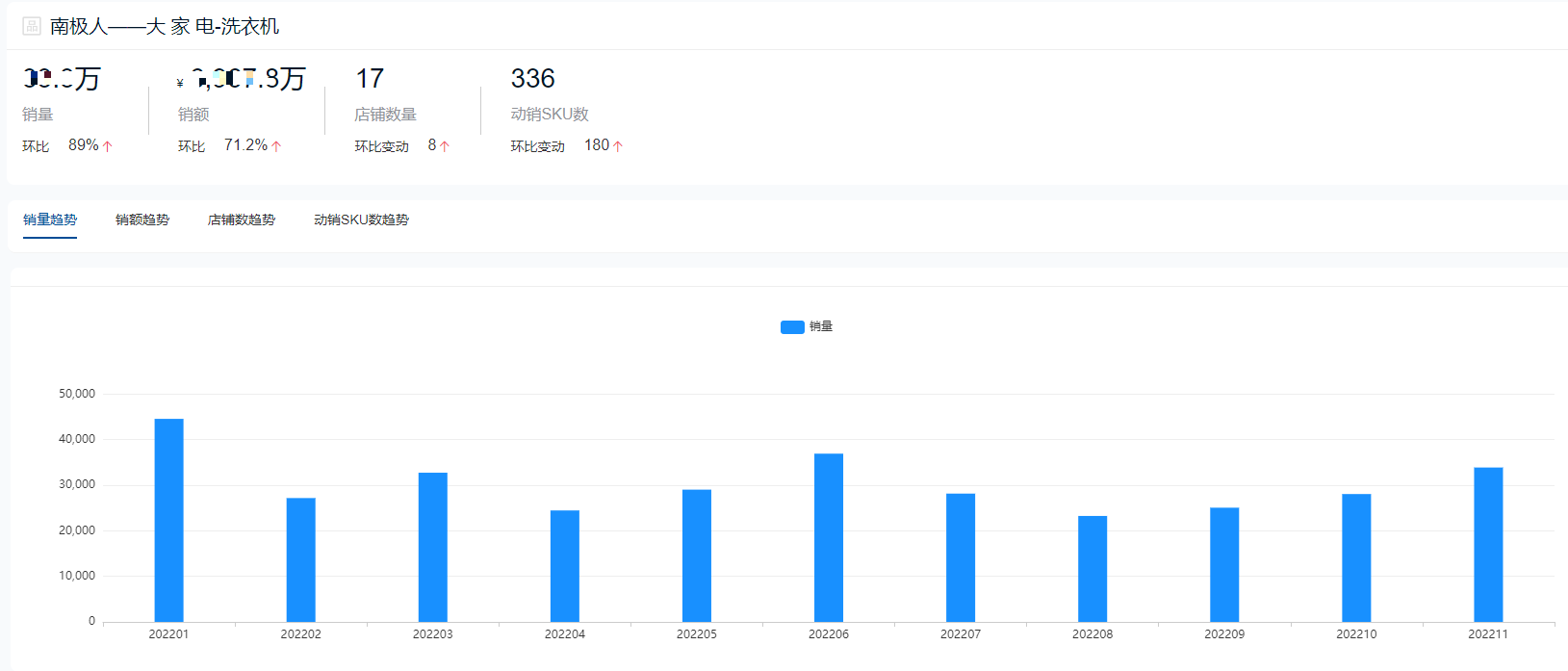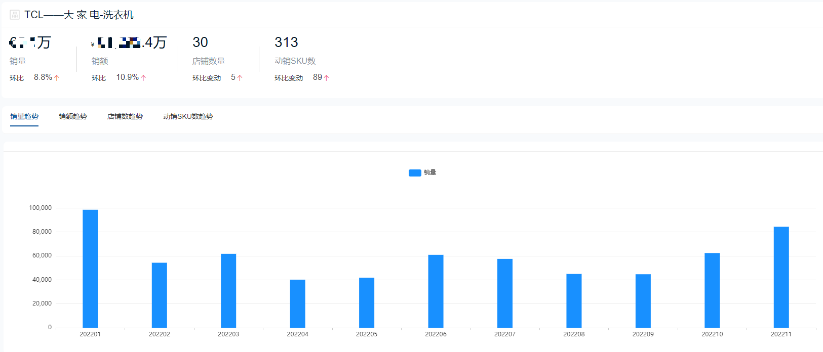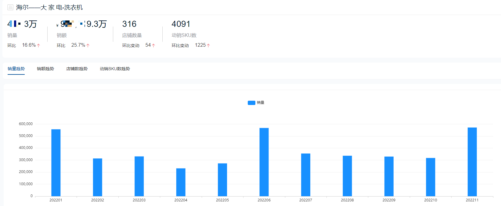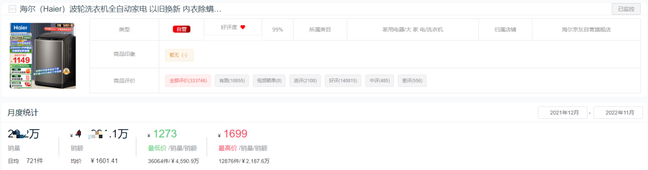 根據鯨參謀數據顯示,2022年海爾品牌仍在洗衣機領域整體銷售成績排名第一,全年總銷量將近420萬件,總銷售額超98億元。今年11月份,海爾的銷售成績達到全年巔峰,單月銷量超過57萬件,銷售額超過14億元。目前在京東平臺,海爾相關店鋪超300家,每個月動銷sku數量超過4000個。