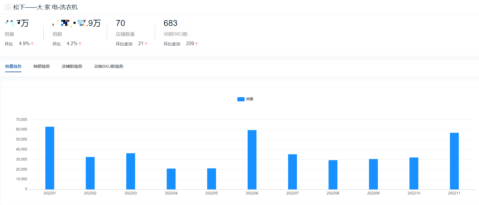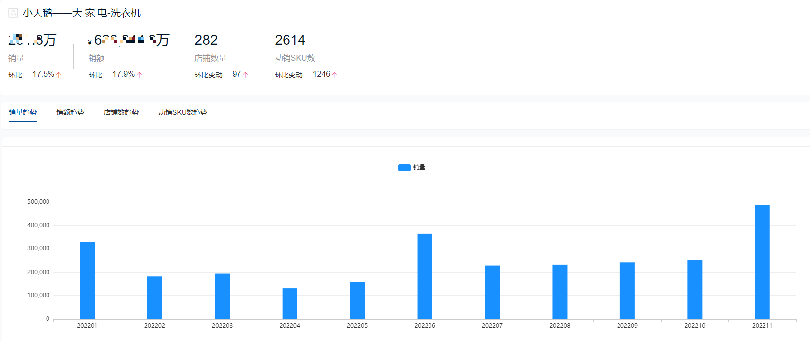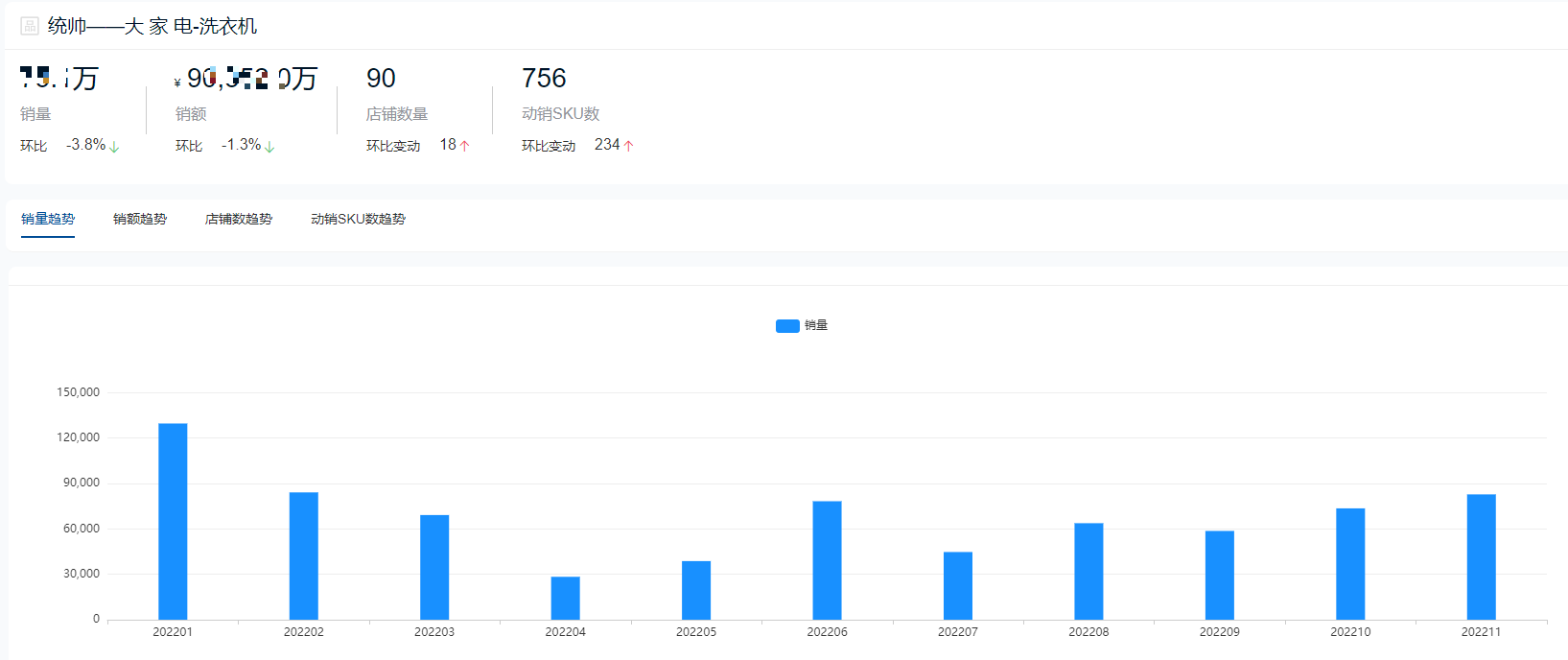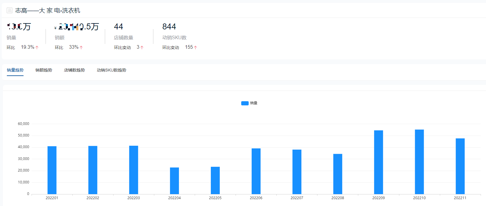 根據鯨參謀數據顯示,2022年海爾品牌仍在洗衣機領域整體銷售成績排名第一,全年總銷量將近420萬件,總銷售額超98億元。今年11月份,海爾的銷售成績達到全年巔峰,單月銷量超過57萬件,銷售額超過14億元。目前在京東平臺,海爾相關店鋪超300家,每個月動銷sku數量超過4000個。