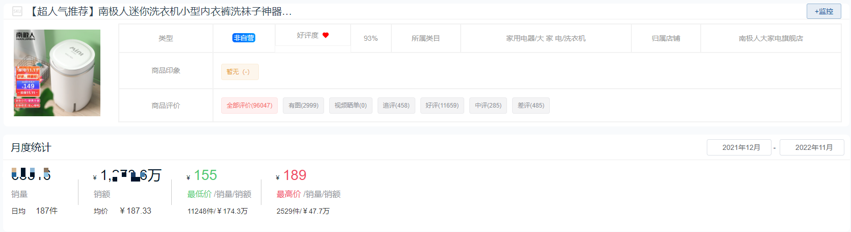南極人的這款迷你小型洗衣機是南極人的熱榜商品,今年在京東平臺累計銷售近7萬件,累計銷售額過千萬元。該款產品歷史最低價曾低至155元,最高為189元。