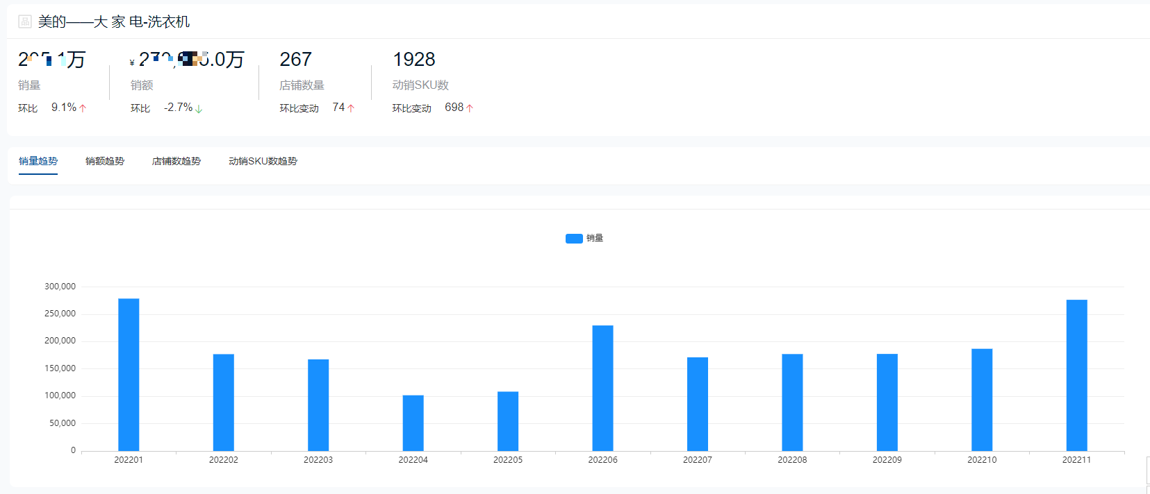 2022年美的銷量在總銷量品牌排行榜中位列第三。根據統計,美的全年總銷量超200萬件,總銷售額超27億。今年1月份,美的洗衣機的銷量全年最高,近28萬件。