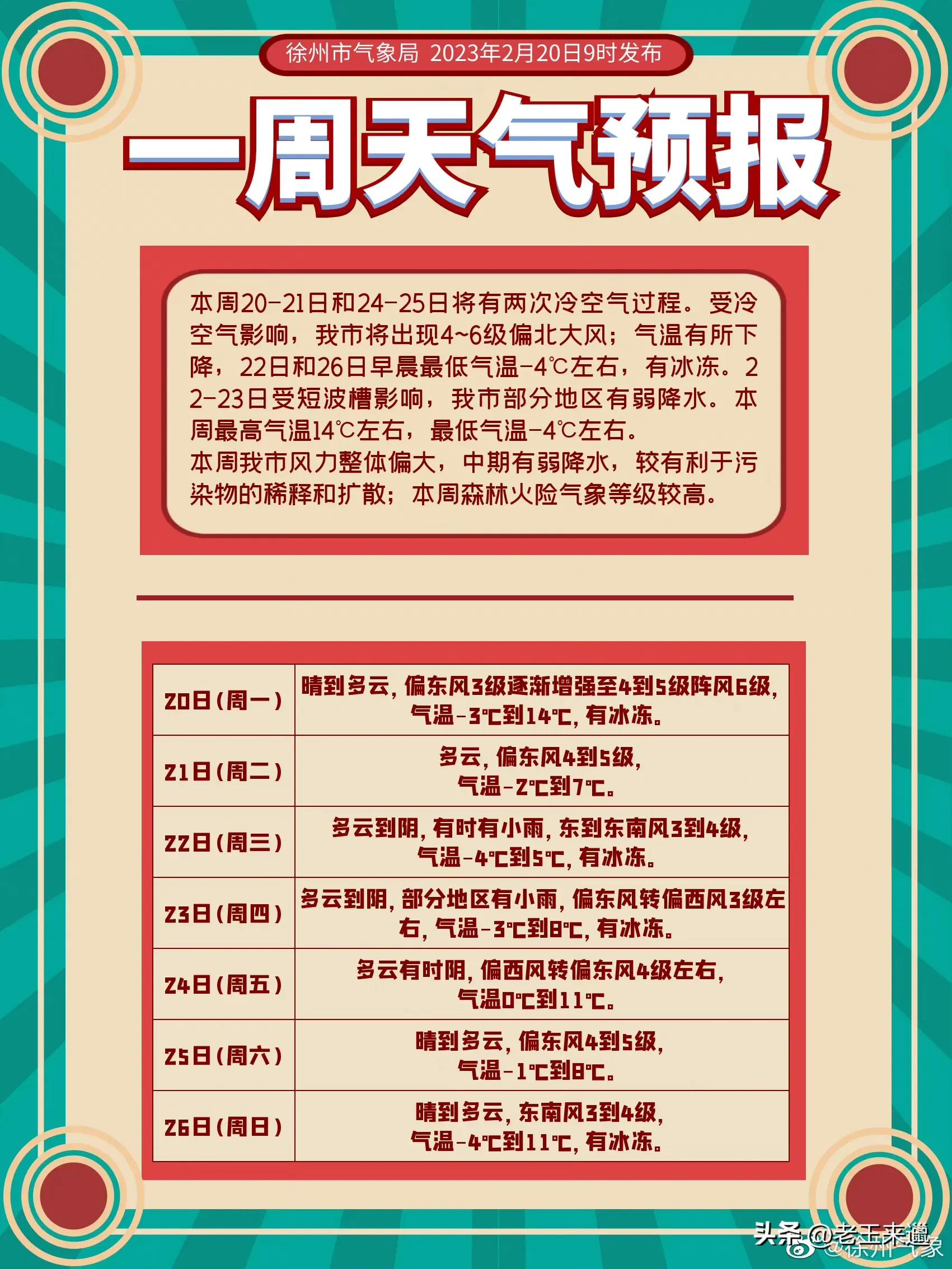 本周20-21日和24-25日將有兩次冷空氣過程。受冷空氣影響,我市將出現4~6級偏北大風;氣溫有所下降,22日和26日早晨最低氣溫-4℃左右,有冰凍。22-23日受短波槽影響,我市部分地區有弱降水。本周最高氣溫14℃左右,最低氣溫-4℃左右。