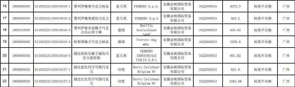 根據通報,上述7批次產品分別為費列羅榛果巧克力制品(產地意大利,4072.5千克)、費列羅榛果威化巧克力(產地意大利,463.2千克)、費列羅能多益榛子巧克力夾心餅干棒(產地德國,430.65千克)、哈努塔榛子巧克力制品(產地德國,1029.6千克)、健達繽紛樂榛子威化巧克力迷你裝(產地意大利,661.82千克)、健達藍色代可可脂巧克力(產地印度,921.6千克)及健達紅色代可可脂巧克力(產地印度,1063.68千克),進口商同為安徽必映國際貿易有限公司。進出口食品安全局表示,未準入境食品均已在口岸依法做退運或銷毀處理。