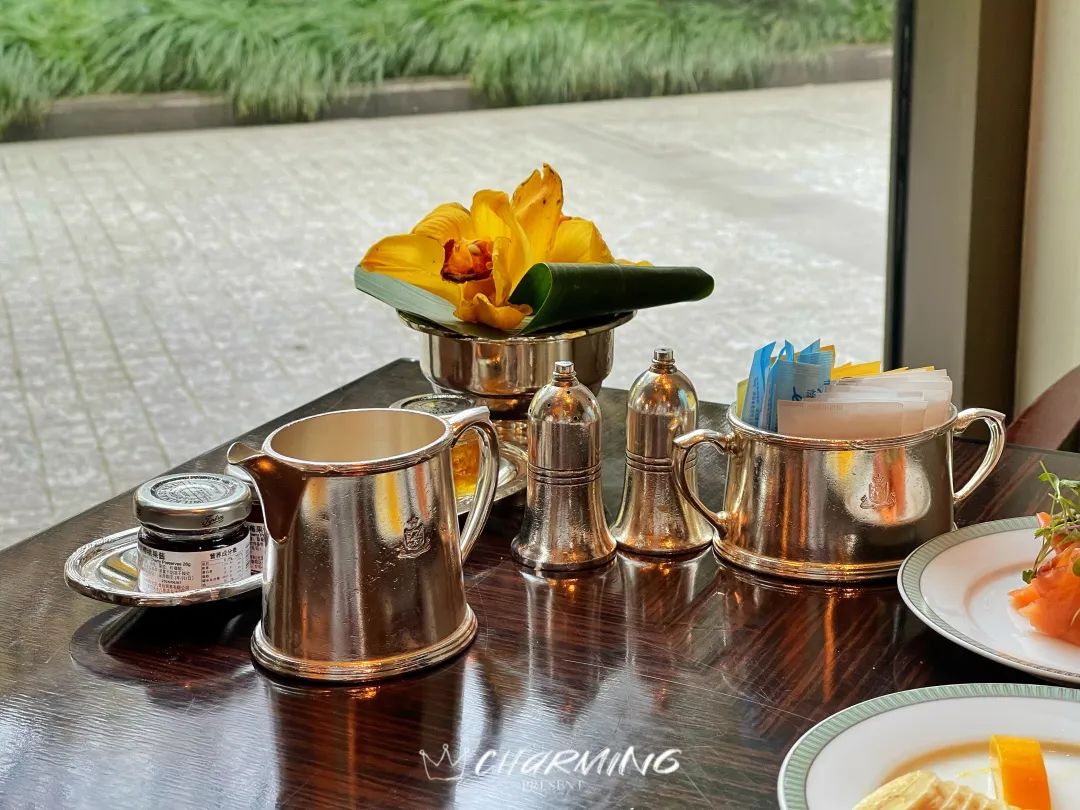 為什么說半島的早餐極具儀式感?因為,目光所及,皆為銀器,不僅僅是刀叉,調味瓶、奶壺、盛放糖包和果醬的容器,甚至連裝鮮花的器皿都是,試問除了半島,上海還有哪家奢華酒店可以做到如此的儀式感?