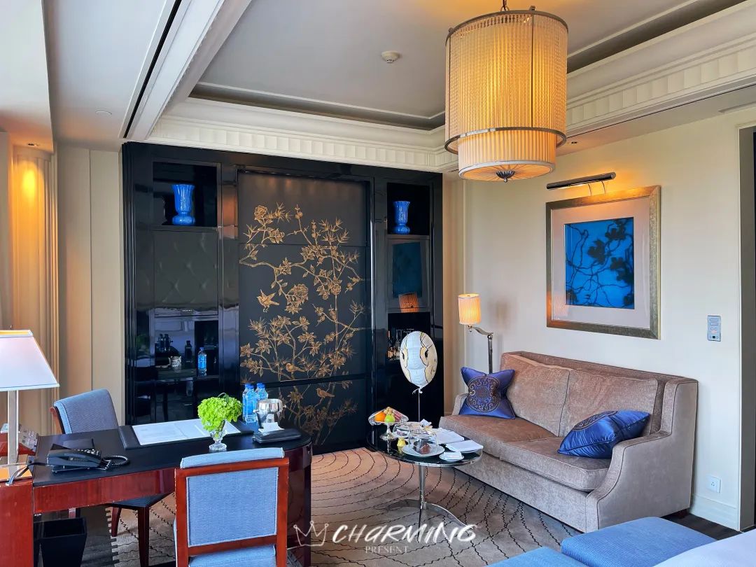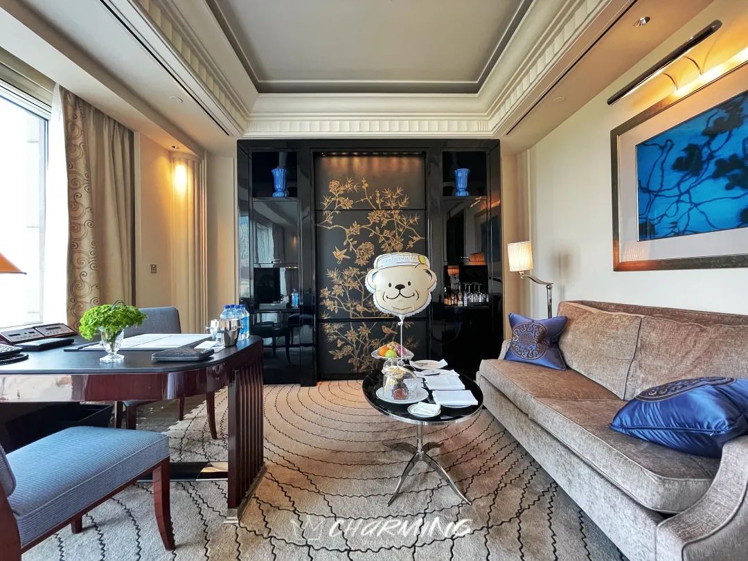 房間的另一半面積為臥室區域。精致且合理的空間分布使得這個區域又分割成了會客區、工作區和休息區三個區域。客房維護十分出色,宛若一位保養得到的中年貴婦,你很難發現歲月在這里留下的痕跡。