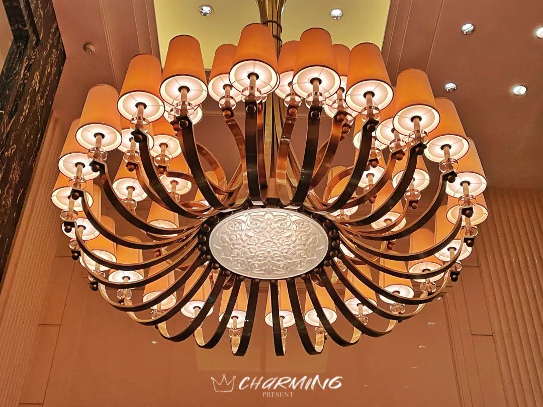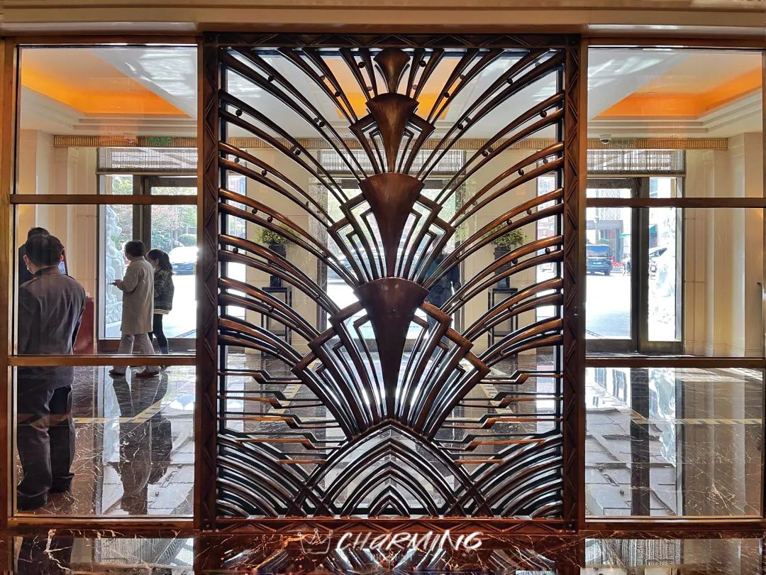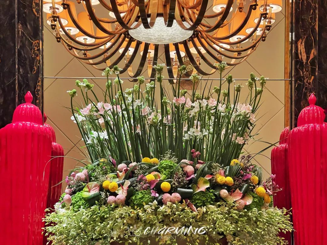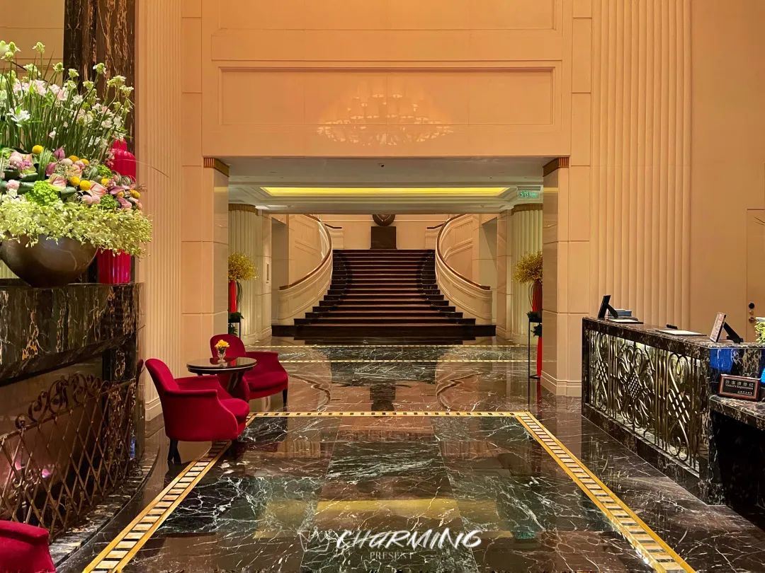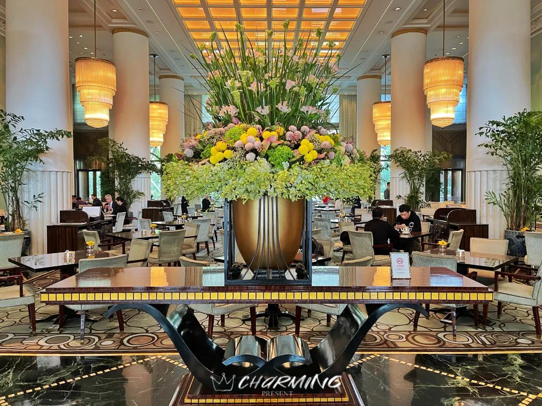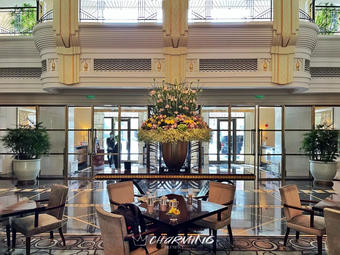 大堂內高掛的銅質吊燈和花團錦簇的花藝令人動容。