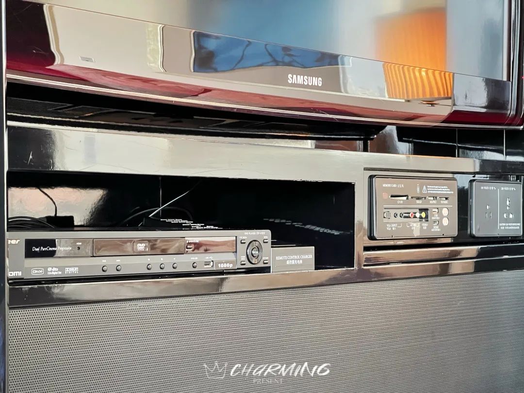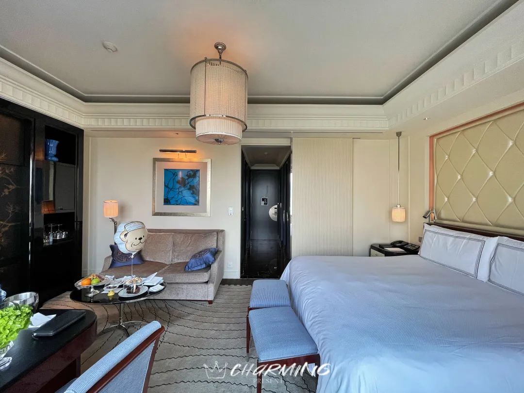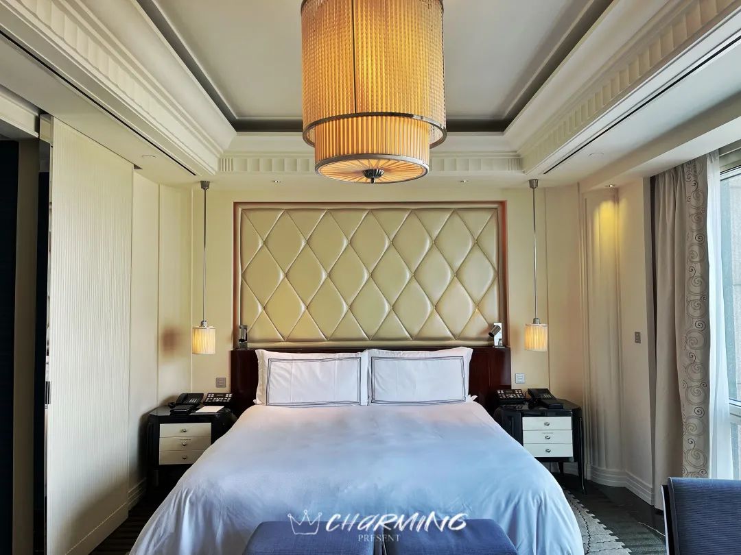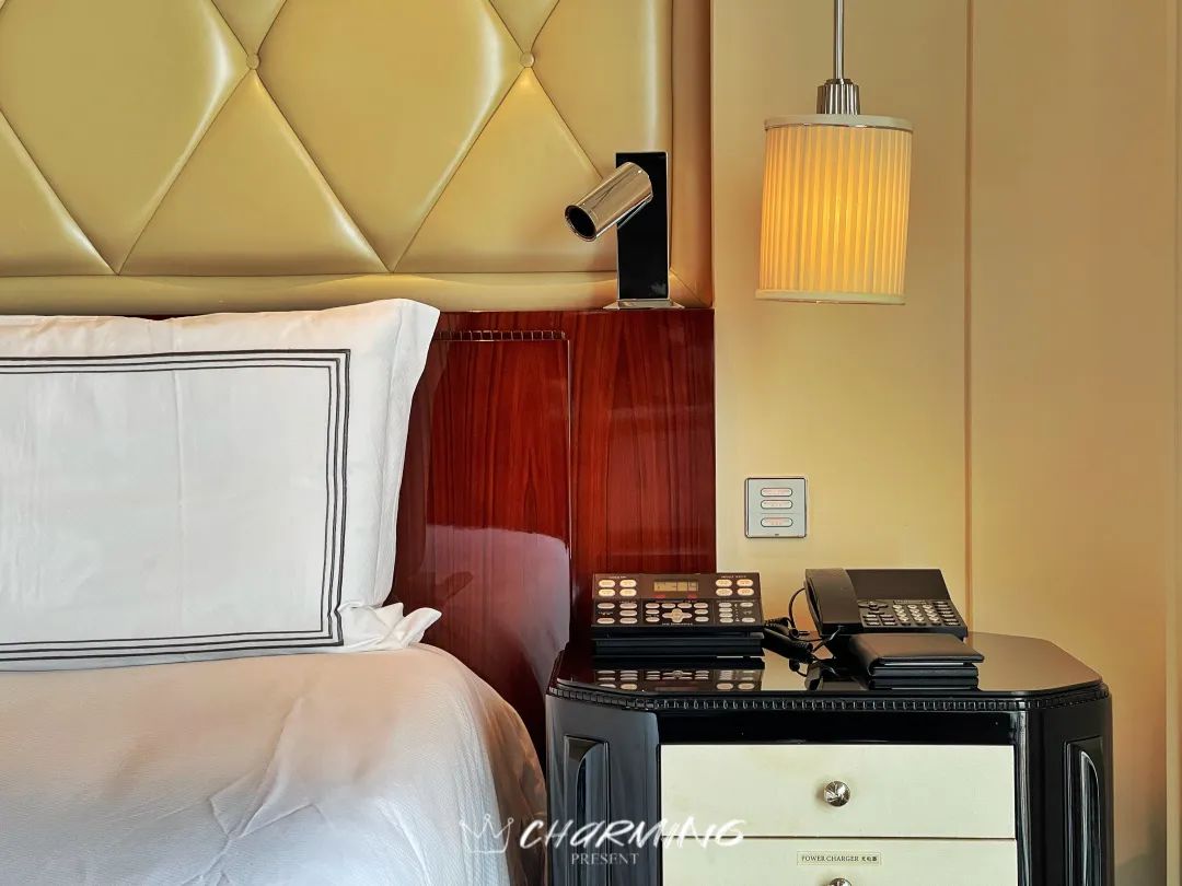 休憩區域以乳白色皮革作為背板,高貴典雅。高織數的床品細滑細膩,床墊較軟但是托付感很好。充電口全部隱藏在床頭柜內,并且酒店給每個床頭柜都配備了無線充電。