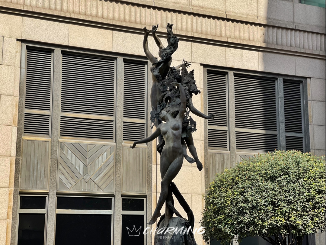 穿過酒店的花園,經過幾處充滿異域風情的雕塑,看到東方明珠的尖尖在建筑群中若隱若現。