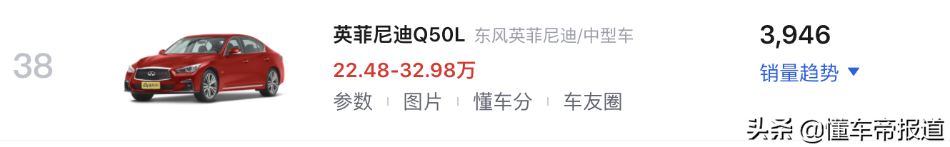 從國內市場來看,英菲尼迪Q50L定位為一款豪華品牌中型轎車,同級車型包括奔馳C級、寶馬3系、奧迪A4L、凱迪拉克CT5、捷豹XEL等。在銷量方面,英菲尼迪Q50L近一年銷量為3946輛,銷量走勢顯示,其月銷量均在400輛以下。