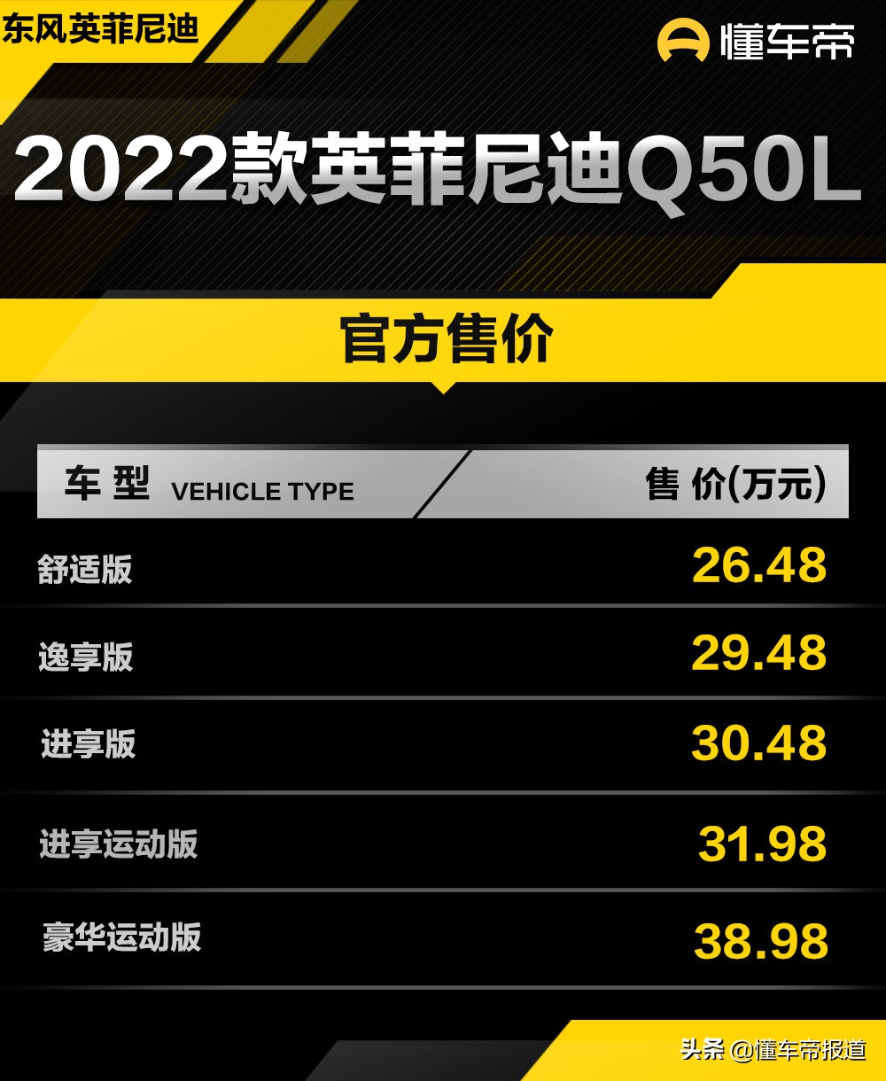 [懂車帝原創 產品] 日前,我們從英菲尼迪官網獲悉,2022款Q50L上市。與2021款車型對比可見,2022款Q50L可選車款數量從6款減少至5款,取消售價為35.98萬元的2021款2.0T 豪華版車型。2022款Q50L 5款車型售價與2021款保持一致,售價區間為26.48萬-38.98萬元。