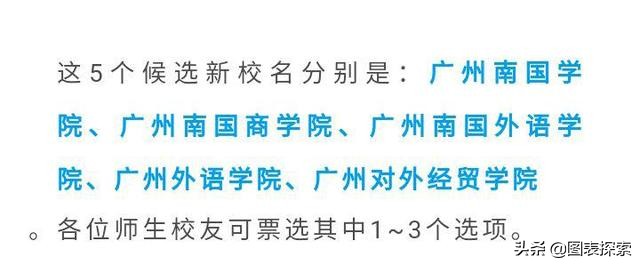 南國商學院曾經提出5個校名供本校師生參考,分別是廣州南國學院,廣州南國商學院,廣州南國外語學院,廣州外語學院,廣州對外經貿學院。從學校方面的提供的5個校名發現學校基本上是計劃以廣州命名,這個已經成為基調,基本不會以廣東命名了。在5個校名中南國出現了3次,外語出現了兩次,這就意味著學校還是希望保留南國這個學校獨立的特色以及學校的優勢專業外語,這也意味著學校最有可能命名廣州南國外語學院!