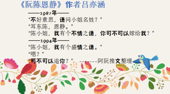 這本書最吸引阿阮的是女主角陳恩靜的溫婉堅韌。陳恩靜面對來自自己從小就深愛的丈夫的各種傷害,都維持了風度,這也是后來阮廷東注意到她的原因。