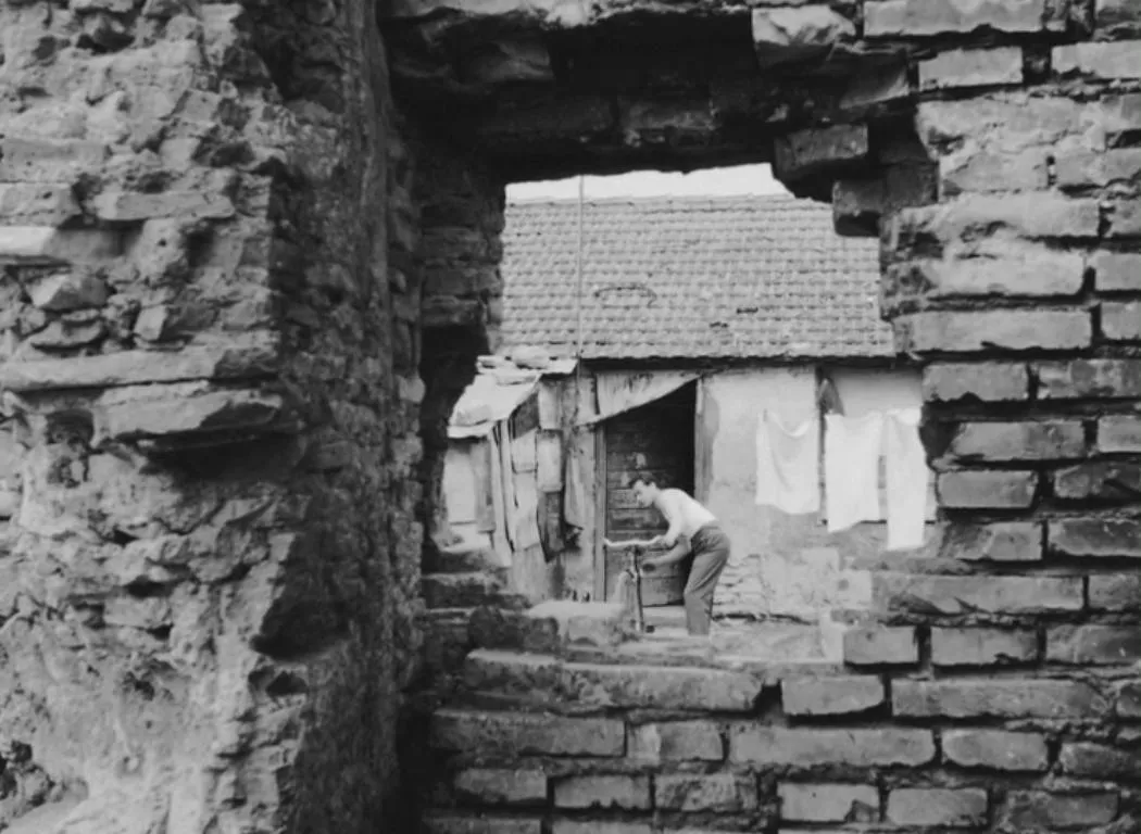 相比一些新現實主義電影所擁有的紀實感,帕索里尼在處女作中更注重視覺性的表達方式,如他自己所言,影片在視覺上比較多地參考了畫家馬薩喬。有「現實主義開荒者」之稱的馬薩喬在藝術史里通常被認作是最早用透視畫法的畫家,我們在《乞丐》中也偶爾會看到透視感很強的處理(如圖1)。