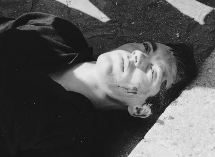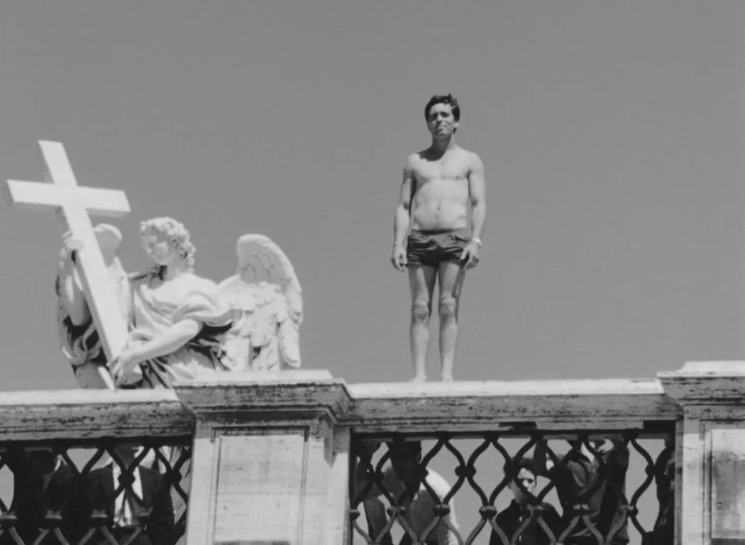要準確理解《乞丐》這部電影要回到影片的核心角色維多利身上。不論是根據帕索里尼的自述,還是從影片自身的呈現來看,維多利都了可以視為基督的化身。影片開場第一個鏡頭引用但丁《神曲》「煉獄篇」中的詩句[1]來為維多利背書。接著介紹人物性格的開場,維多利跳水顯勇的那場戲,跳水那一刻角色旁邊就是十字架(圖5)。