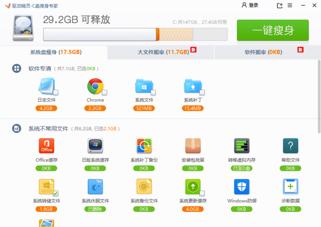 支持清理系統緩存垃圾、大文件、軟件搬家等;