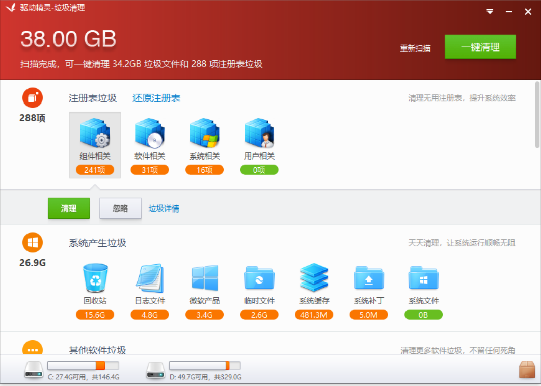 針對電腦運行過程中產生的緩存垃圾文件,可以根據類型選擇清理;