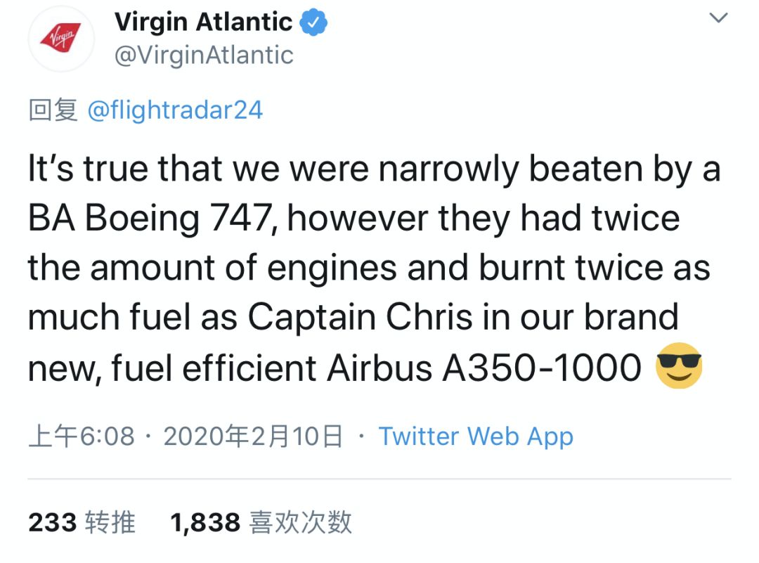 對此說法,維珍大西洋航空也不甘示弱地做出了回應:“沒錯,我們是被英航的波音747以一點點的時間優勢所打敗,但英航飛機比我們最高效的A350-1000引擎多了一倍、燃油消耗也多一倍”。