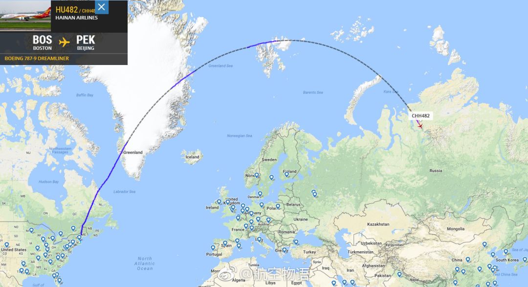 一路向東回國的HU482航班,里程增加但可能速度更快(圖源:FR24)