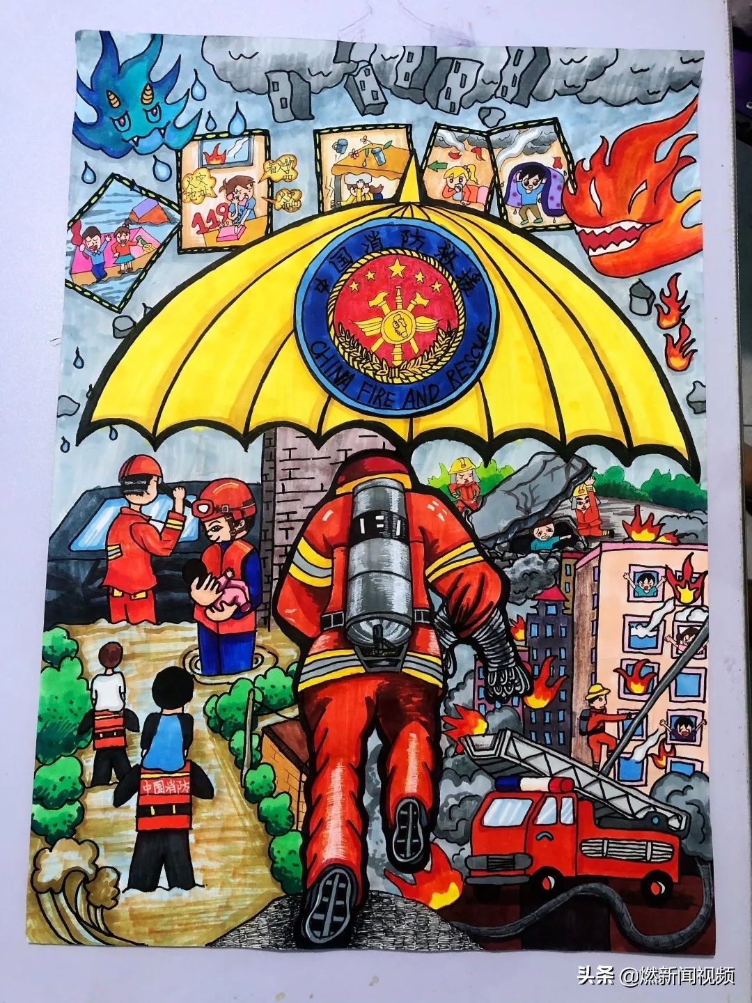 福建廈門市集美小學的隊員賴婧瑜也有話說。在他看來,世界上最可愛的人是消防戰士。他們用最帥的逆行,為我們遮風擋雨,保駕護航!他用畫筆,向英勇無畏的消防戰士致敬!