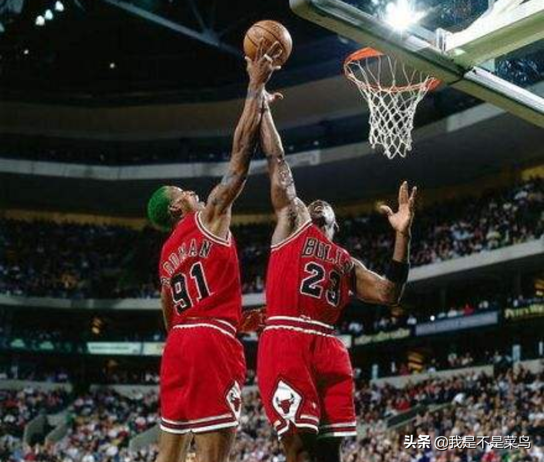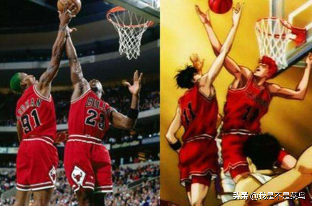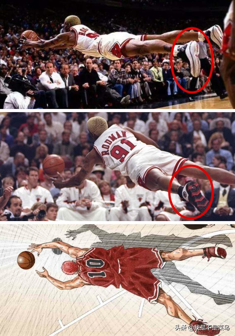 如果按照人物對應,流川楓——喬丹,櫻木花道——羅德曼,這張照片和《灌籃高手》片尾的畫面相比較菜鳥認為同樣巧合得完美。而羅德曼平行于地板飛身撲救的照片也絕對不止一張,哪怕球衣顏色和發型沒變,但羅德曼穿的球鞋并不是同一雙。所以巧合來得要比我們想象中的容易!