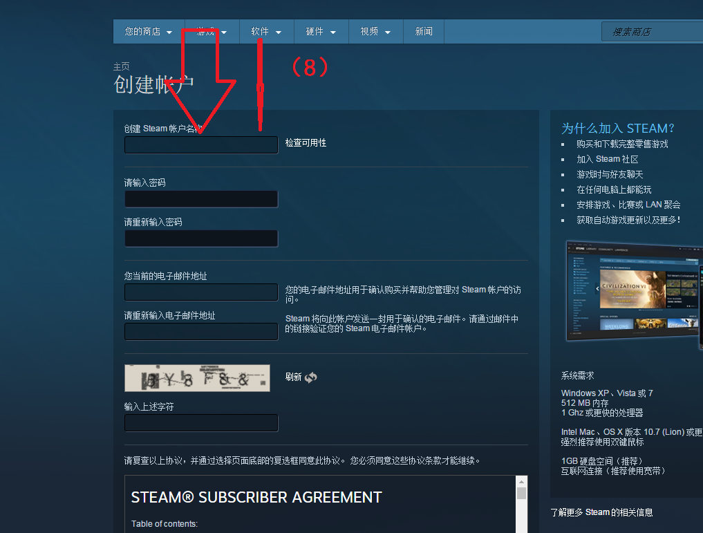 第三步,注冊Steam賬號,點擊右上角的登錄(6),點擊加入Steam(7),填寫下下圖相關信息。