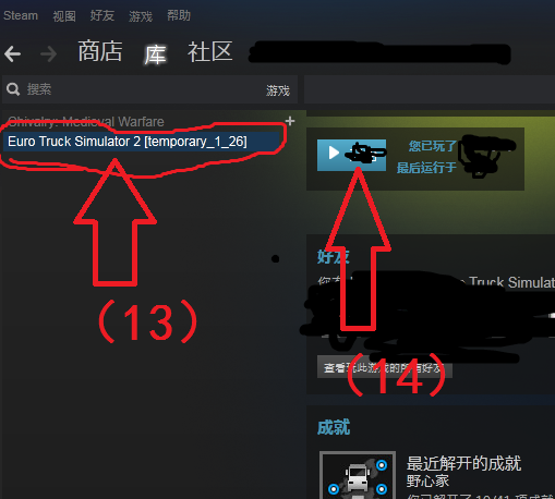 然后點擊左上角的庫,會發現Euro Truck Simulator 2(如13),接下來點擊(14)的安裝就好了,注意安裝路徑還是剛剛安裝Steam的路徑,文件夾一樣不可以有中文,接下來就可以開啟你的模擬駕駛旅行了。