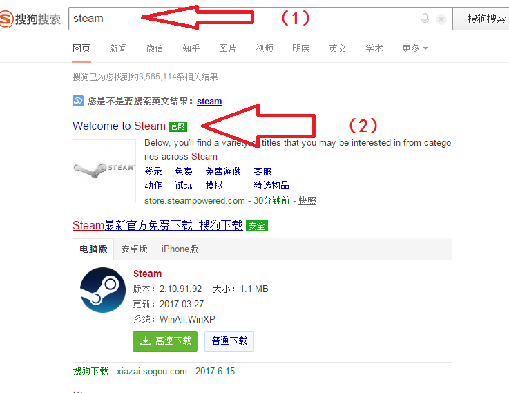 首先,第一步下載Steam平臺。打開任意一個瀏覽器,然后搜索Steam(如下圖),然后點擊第2點。