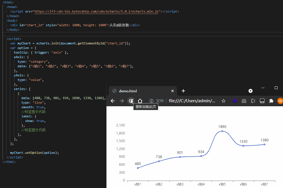 思路打開 , 先找到折線的配置項 , 然后去找標簽的配置項 , 然后把標簽顯示出來 .