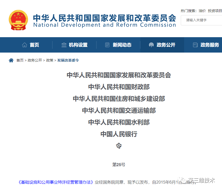 2015年4月,中華人民共和國國家發展和改革委員會、中華人民共和國財政部、中華人民共和國住房和城鄉建設部、中華人民共和國交通運輸部、中華人民共和國水利部、中國人民銀行聯合發文《基礎設施和公用事業特許經營管理辦法》(第25號令),鼓勵和引導社會資本參與基礎設施和公用事業建設運營,提高公共服務質量和效率,保護特許經營者合法權益,引導規范PPP的開展。