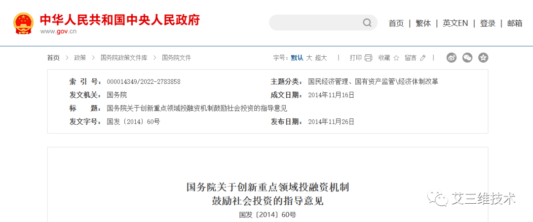 國務院發文《關于創新重點領域投融資機制鼓勵社會投資的指導意見》,提出實行統一市場準入,創造平等投資機會;創新投資運營機制,擴大社會資本投資途徑;優化政府投資使用方向和方式,發揮引導帶動作用;創新融資方式,拓寬融資渠道;完善價格形成機制,發揮價格杠桿作用。