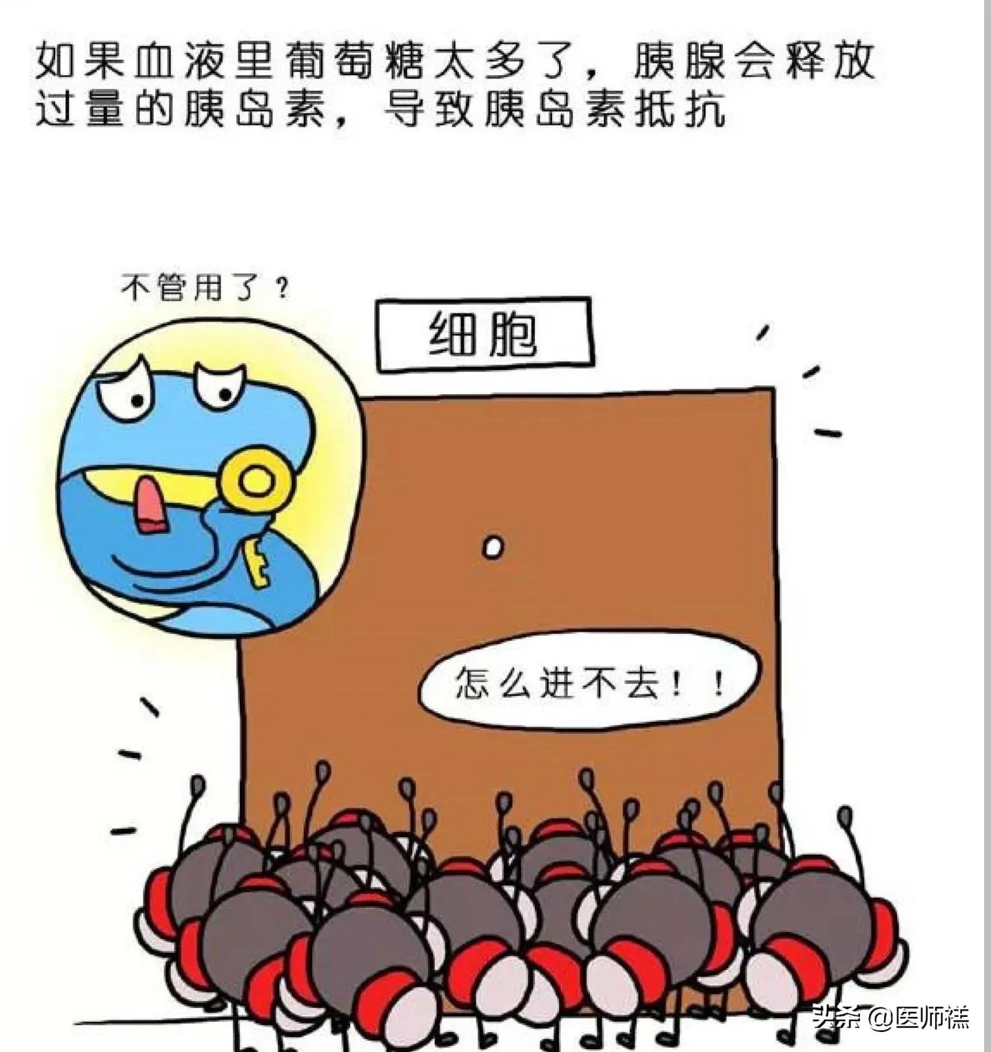 當身體對胰島素的反應不佳時并且葡萄糖難以進入細胞時,就會出現胰島素抵抗。想象一下,細胞是一扇鎖著的門,但鑰匙孔生銹了,所以葡萄糖很難進去。胰腺不斷泵出更多的胰島素來提供幫助,但葡萄糖仍然很難進入細胞。這會導致血糖水平升高。