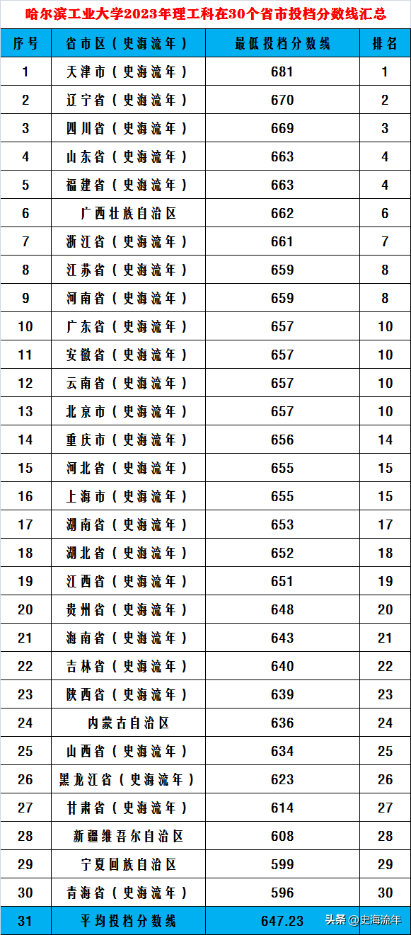 而2023年高考,哈爾濱工業大學本部在全國28個省、市、自治區統一招生平均投檔分數線是647.23分,比2022年提高了22.29分,排名全國第十位。